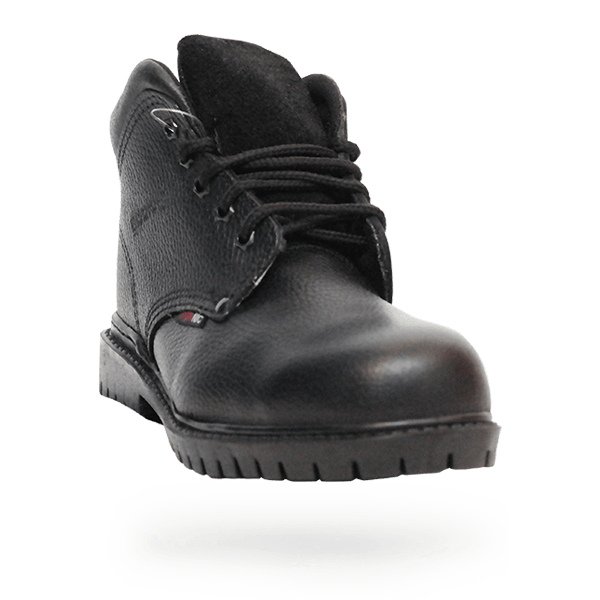 Calzado dieléctrico tipo borceguí color negro con puntera de acero, suela de hule con acrilo- nitrilo, bullón superior y forros interiores acojinados.